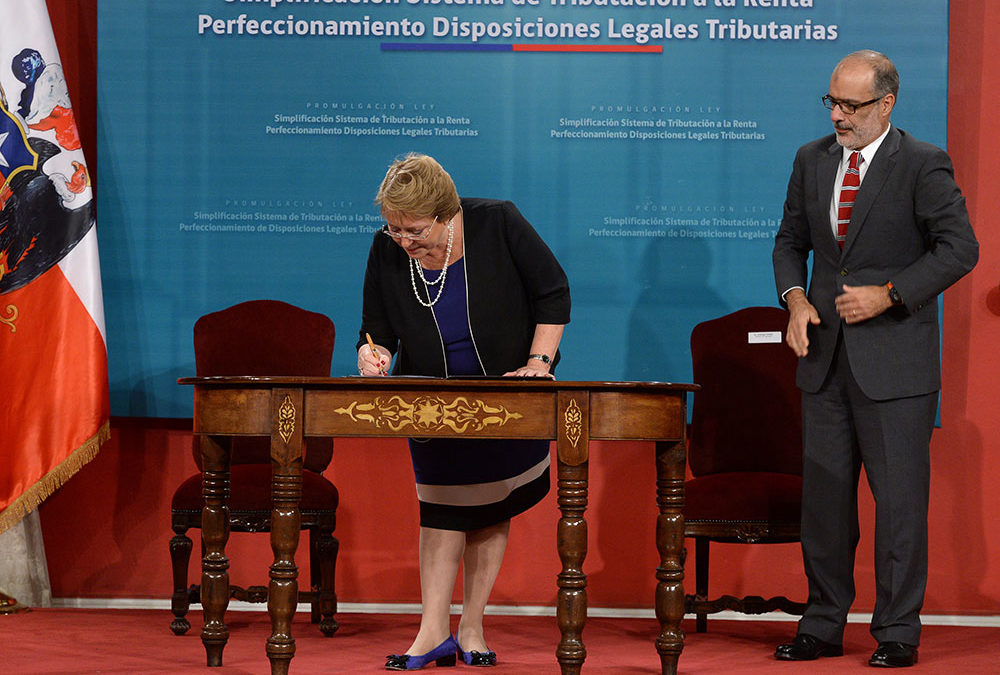 La Presidenta Michelle Bachelet promulgó este lunes la Ley que simplifica la reforma tributaria. La inciativa que fue ingresada al Congreso el 15 de diciembre del año pasado, modifica tres puntos de la reforma aprobada en 2014: el sistema de Impuesto a la Renta, del IVA y el Código Tributario.